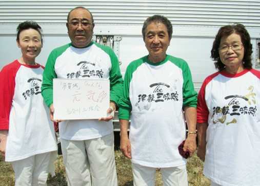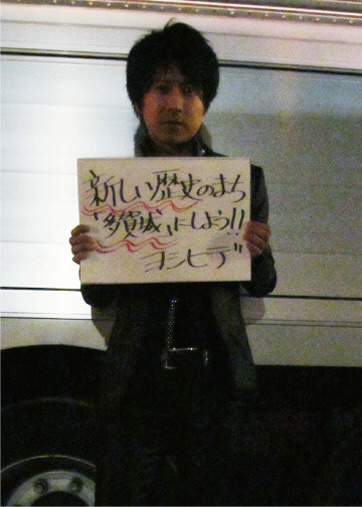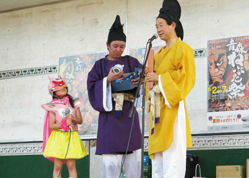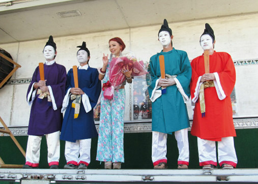 不思議な集団、麻呂武将隊(?)から多賀城の復興を応援してくれている蒼井さんへ、花束のプレゼントです。