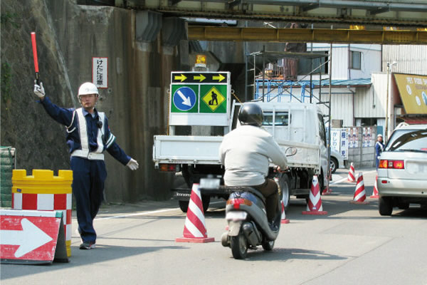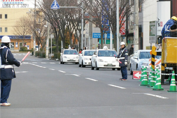 通行車両には道路交通法に基づいた適切な誘導合図により事故の防止、渋滞の緩和に最大限の努力をし、安全の確保のみではなく、現場作業をスムーズに進行させる役割も要求されてきています。