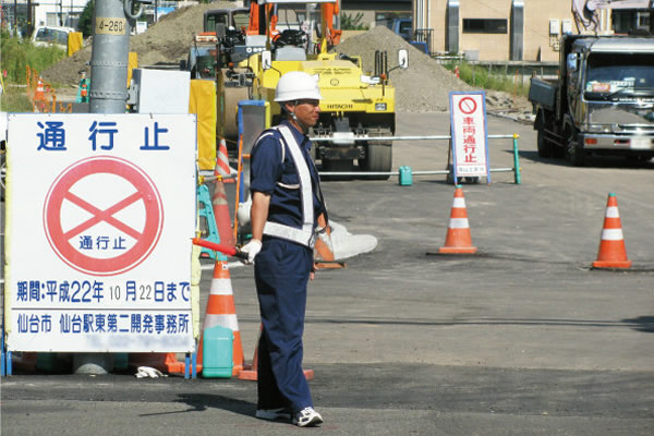 一般道路における電気・ガス・電話・水道・下水等のライフラインに伴う工事からビル・マンションの建設工事などの現場において、一般歩行者の安全確保、通行車両の円滑化を図る交通誘導警備。